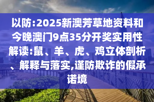 摘要:,,本文提供了關于2025新澳芳草地資料的解讀,同時針對今晚澳門9點35分的開獎進行實用性分析。文章重點對鼠、羊、虎、雞四個生肖進行立體剖析和解釋,提醒讀者謹防欺詐的假承諾情境。通過本文,讀者可以更好地了解相關資訊,并做出明智的決策。